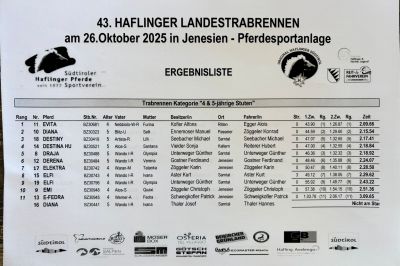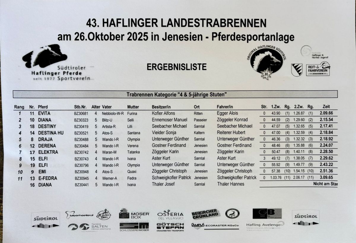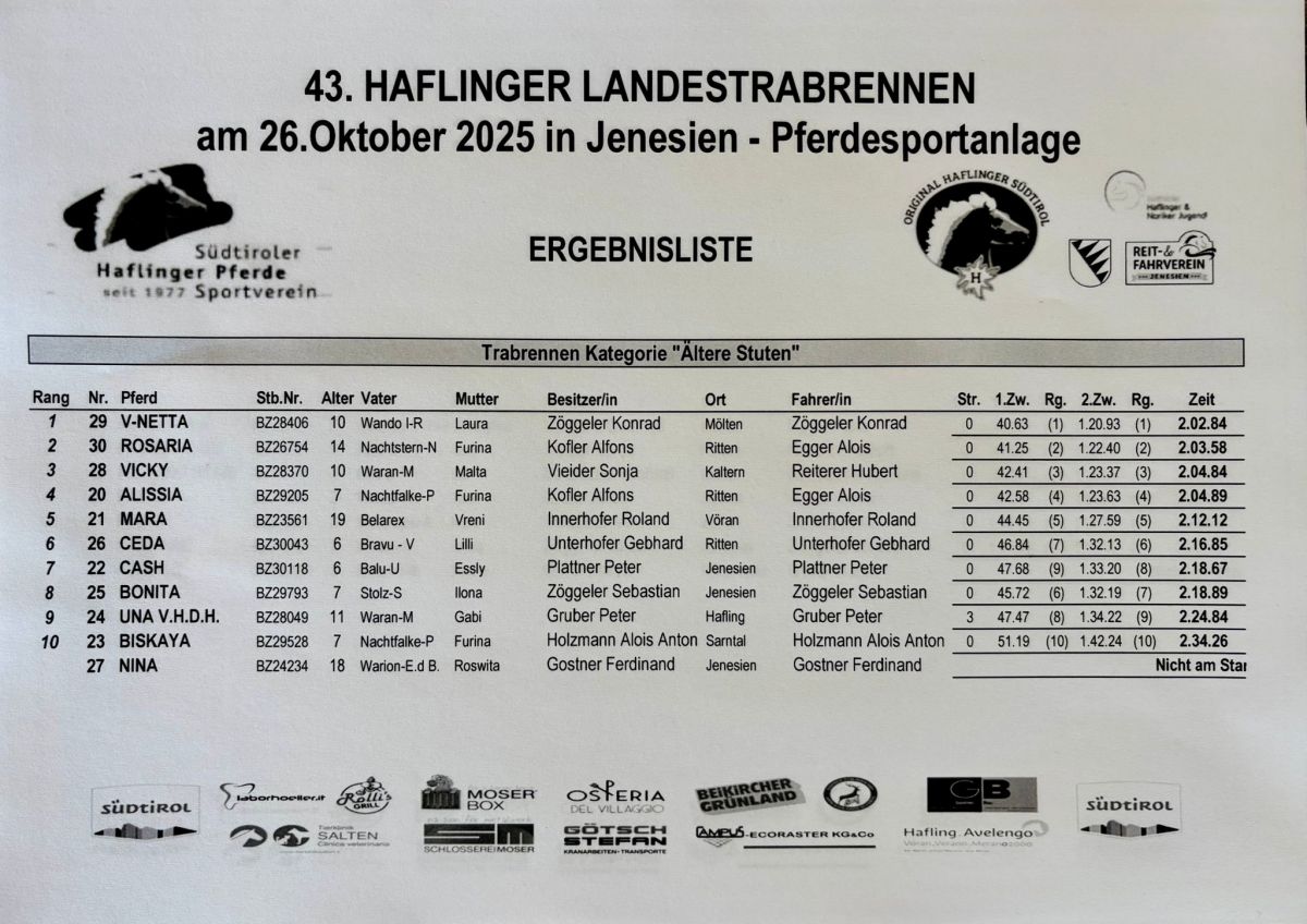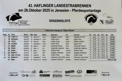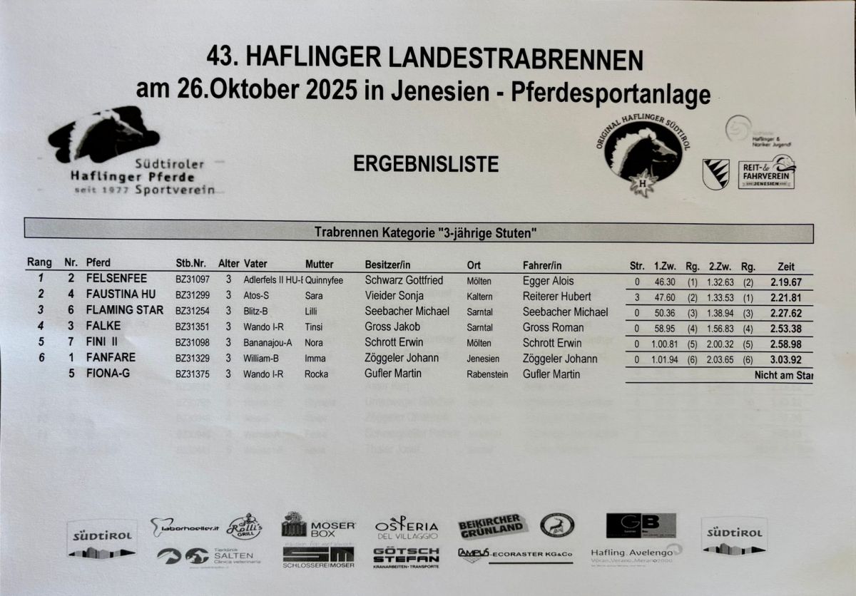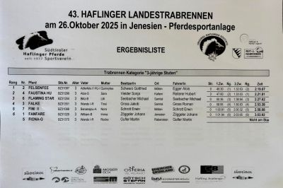Auf dem Reitplatz in Jenesien wurde Heuer das Landestrabrennen der Haflingerstuten ausgetragen. Bei dieser Veransteltung laufen die Haflingerstuten in drei Katregien in Trab mit einem Sulky im Schlepptau einzeln um die schnellste Zeit. Dabei dürfen sie keine Galoppsprünge machen ansonsten erhalten sie Strafsekunden.
